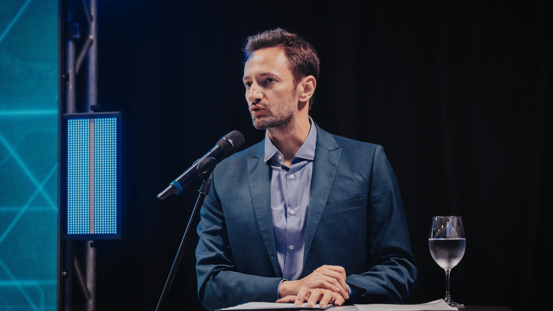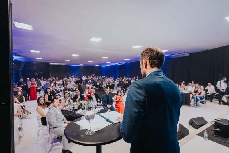 Felipe André Machado, sócio e proprietário da Evolua Consultoria, durante seu discurso, agradecendo a presença de amigos, clientes e convidados, no coquetel festivo pelo aniversário de cinco anos da empresa